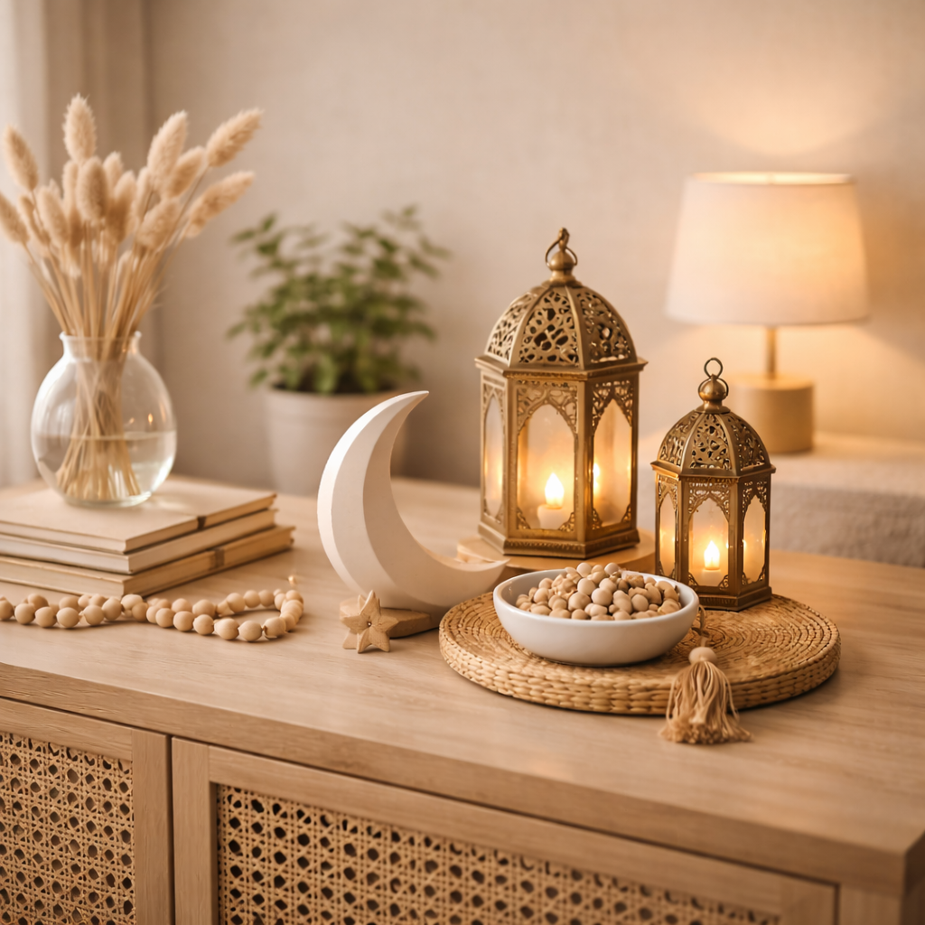 Sebagian keluarga dan tempat usaha memilih menghadirkan suasana Ramadan lewat dekorasi sederhana. Lampu hias, ornamen meja, atau hiasan dinding bertema ringan mulai dicari, terutama menjelang pertengahan bulan.