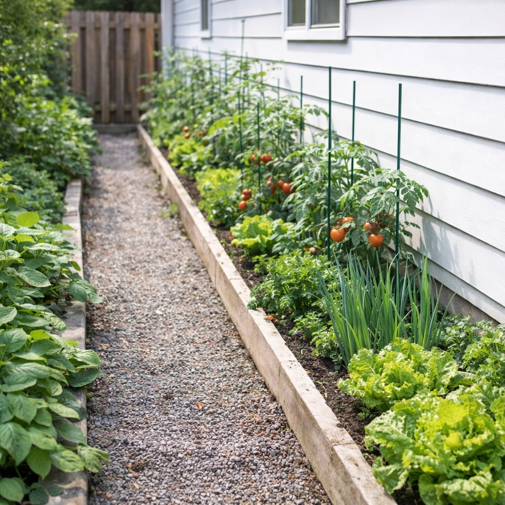 Model kebun linear memanfaatkan sisi rumah atau lorong samping yang sering dilalui penghuni. Logikanya sederhana: semakin sering dilewati, semakin besar peluang kebun tersebut dirawat. Tanaman yang selalu berada dalam jalur pandang membuat pemilik rumah lebih cepat menyadari jika ada yang perlu disiram, dipangkas, atau dipanen.
