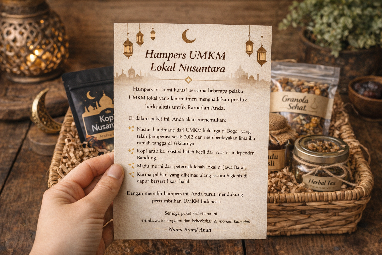 “Paket ini dikurasi untuk menghadirkan pilihan camilan yang lebih seimbang saat berbuka, tanpa tambahan pengawet dan pewarna sintetis.” Atau konsep “Hampers Kopi Nusantara” dengan cerita singkat asal biji kopi dari daerah tertentu.