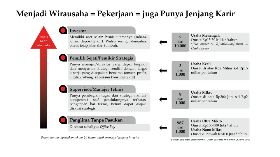 Ini adalah puncak dari jenjang karir wirausaha. Hanya 7 dari 10.000 pelaku usaha yang berhasil sampai di sini. Secara omset, bisnis sudah berada di kategori usaha menengah (Rp15–50 miliar per tahun) atau bahkan usaha besar (di atas Rp50 miliar).