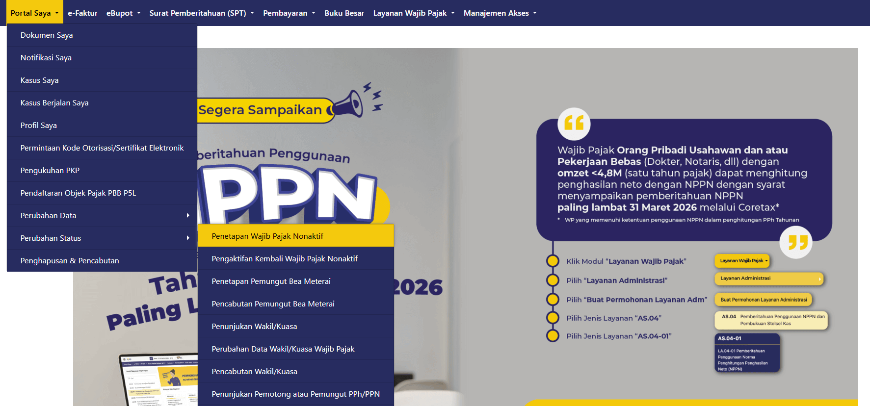 - Otomatis nonaktif melalui Coretax Wajib pajak yang telah melakukan aktivasi akun Coretax DJP, tetapi mengisi klasifikasi lapangan usaha "Belum Bekerja" dengan penghasilan per bulan di bawah Rp4,5 juta secara otomatis diberikan status nonaktif.