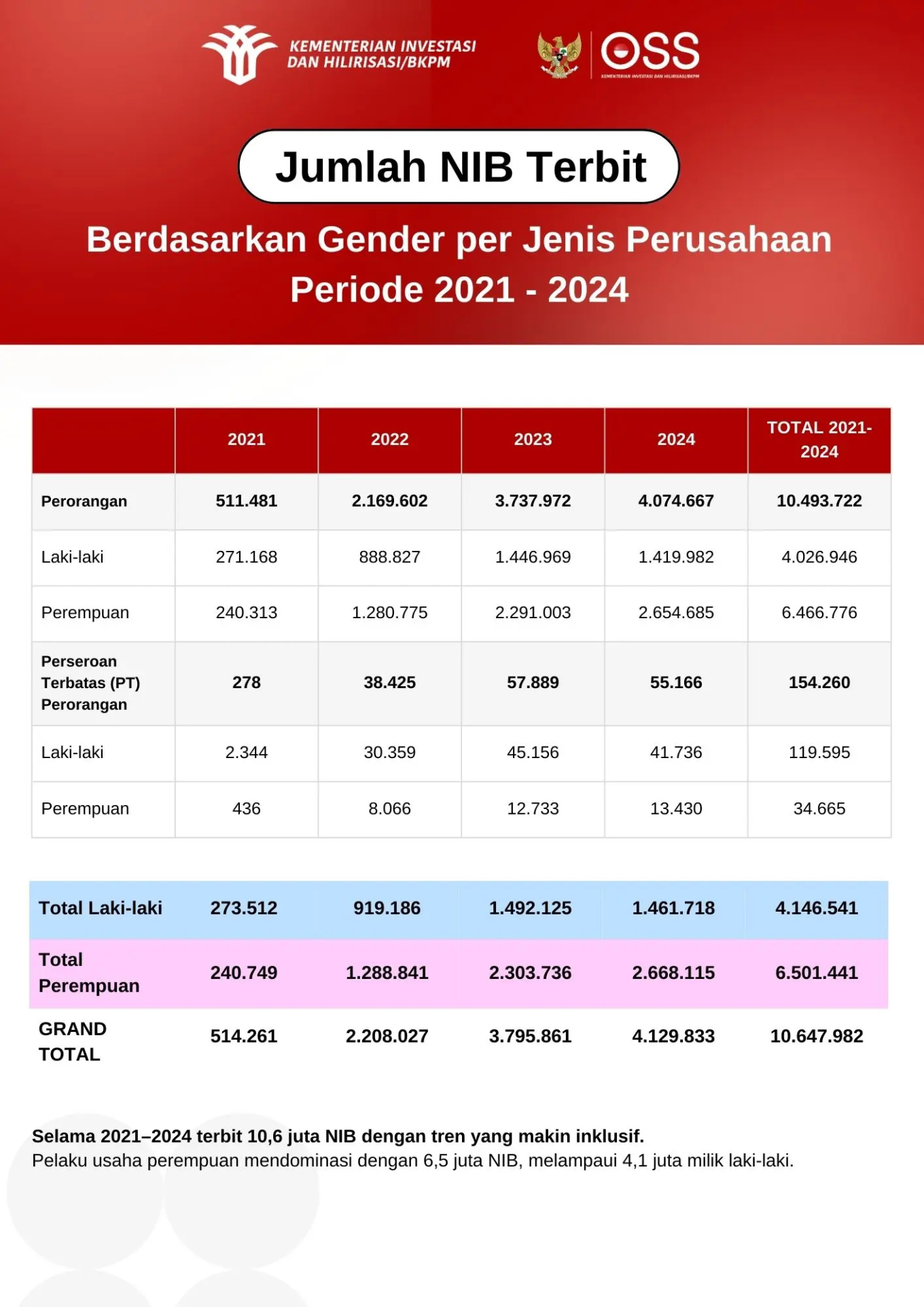 Perubahan ini tercermin dari data perizinan usaha nasional. Melalui sistem OSS, partisipasi perempuan dalam pengurusan legalitas usaha menunjukkan tren yang terus menguat. Sistem perizinan berbasis digital ini membuka akses yang lebih luas bagi pelaku UMKM untuk mengurus Nomor Induk Berusaha (NIB) secara mandiri, tanpa harus berhadapan dengan prosedur birokrasi yang panjang.