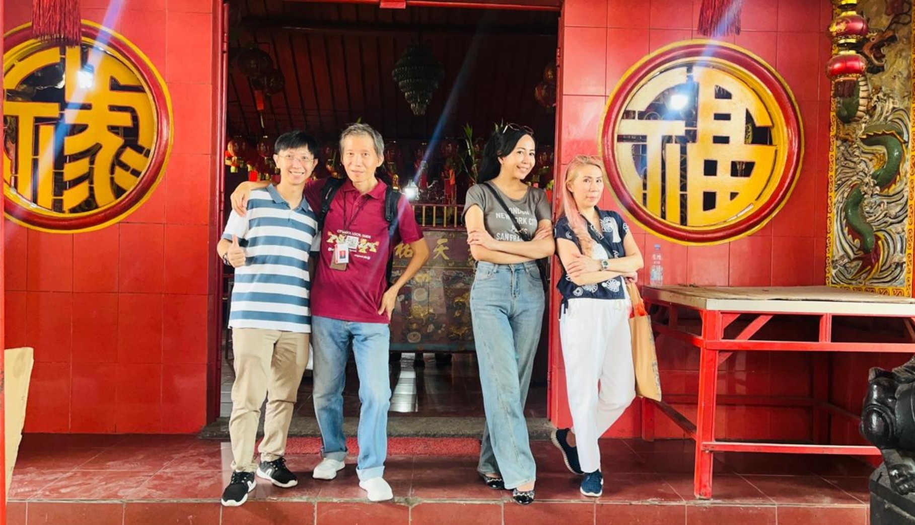 Foto bersama wisatawan lokal (Jakarta): Hari, Budi Wong, Diah Olif, Vica Ng di depan pintu kelenteng (Vihara Buddha)
