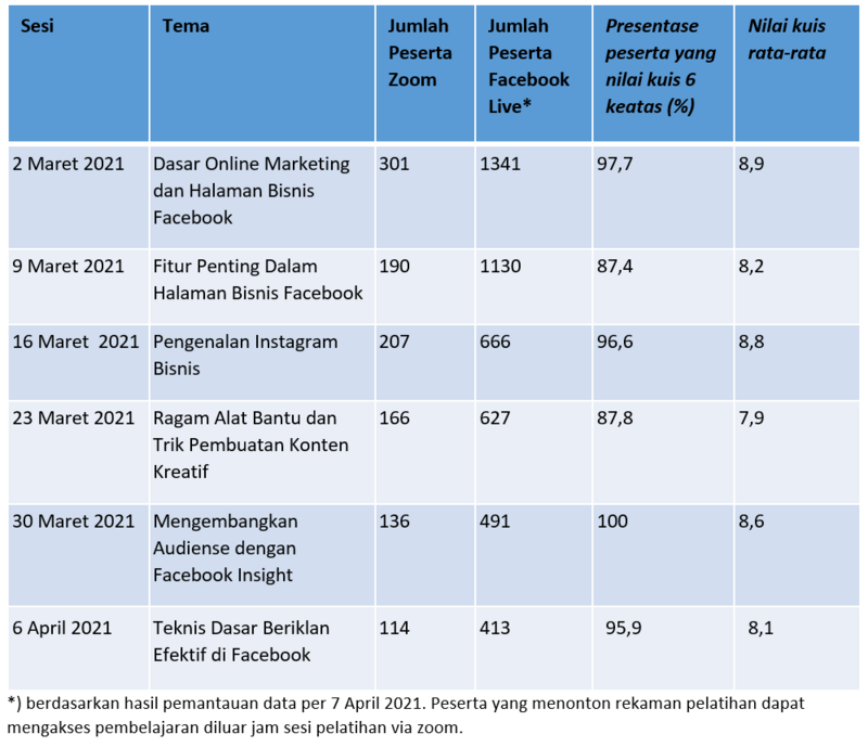 Program ini menerima sekitar 2100 pendaftaran, dan sekitar 1800 menerima undangan untuk bergabung di grup Facebook “Komunitas Belajar UKM Indonesia”, dan bisa terus mendapatkan akses ke seluruh video rekaman sesi pelatihan bersama official trainer facebook tersebut, manakala mereka ingin mengulangnya.