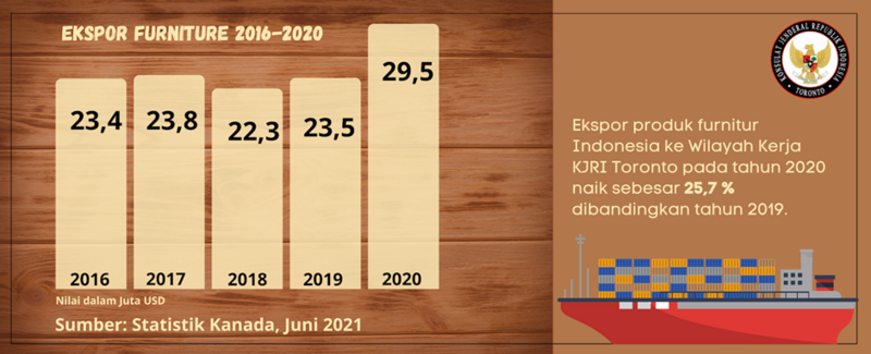 Statistics Canada mencatat bahwa pada 2020 ekspor furniture Indonesia ke Kanada meningkat sekitar 21,4 persen dibandingkan tahun sebelumnya. Sementara pada Triwulan I 2021, ekspor produk tersebut meningkat sebesar 49,4 persen dibandingkan periode yang sama di tahun 2020.